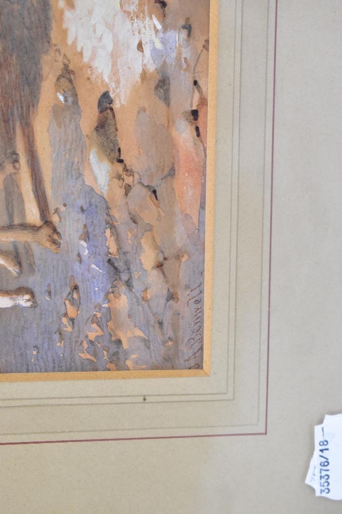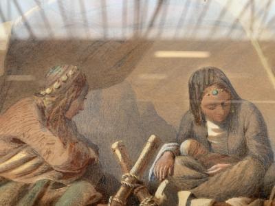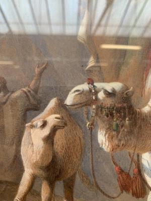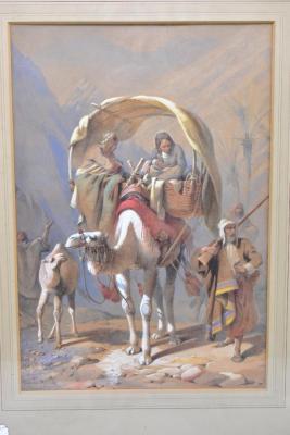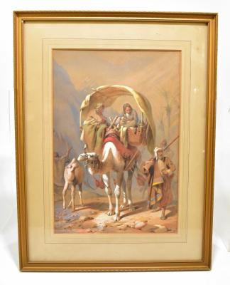 Lot 2419 of 2175: JOSEPH AUSTIN BENWELL (1816-1886); heightened watercolour, Orientalist study of a travelling group featuring two ladies on camel and a figure with rifle to foreground, signed lower right, Boydell Galleries of Liverpool label verso, 37 x 25cm, framed and glazed.