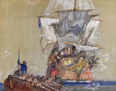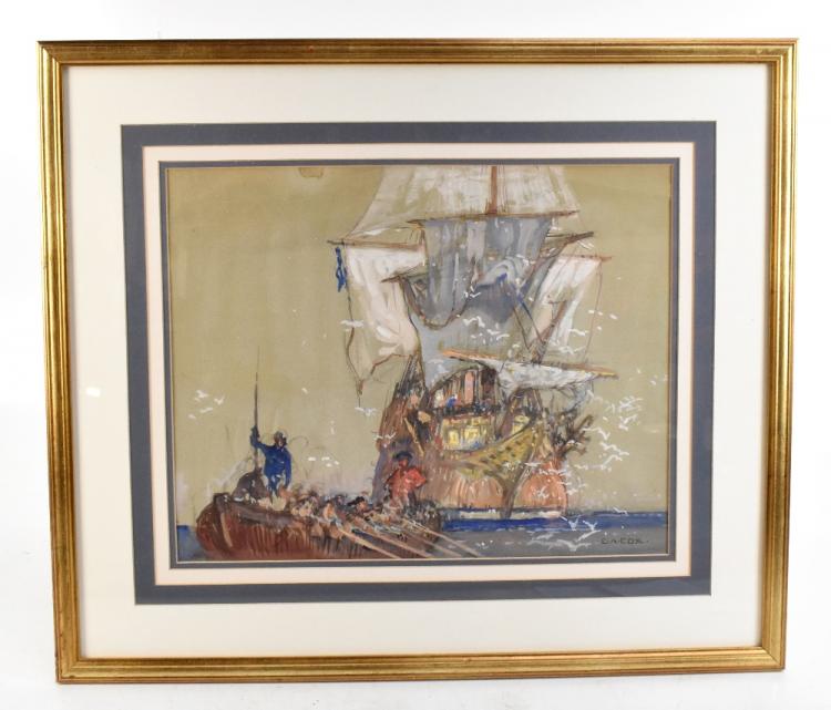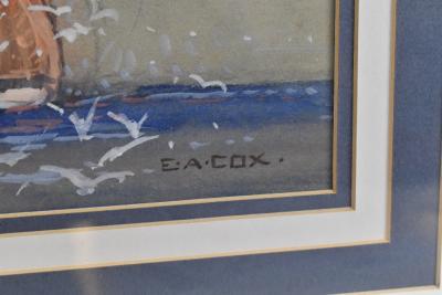 Lot 2422 of 2175: E.A. COX; heightened watercolour, study of a 19th century galleon with manned rowing boat to foreground, signed lower right, 35 x 44cm, framed and glazed. (D)