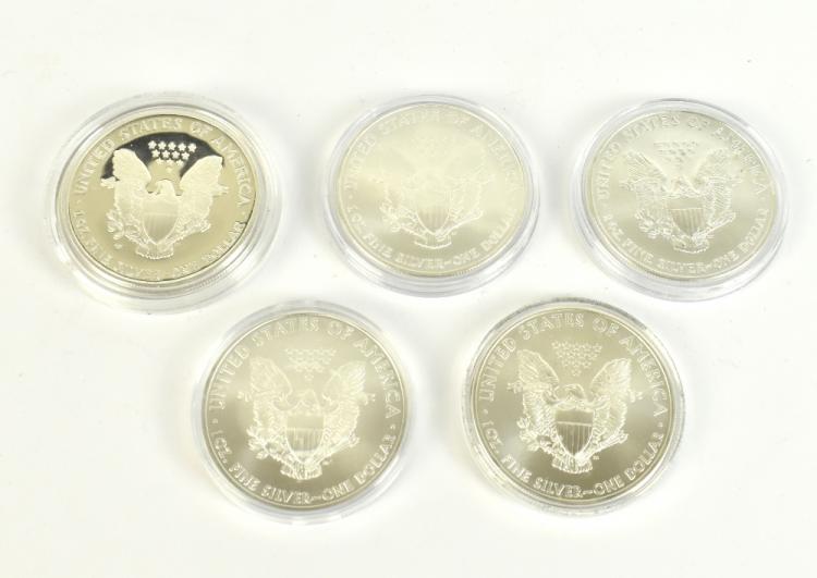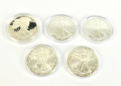 Lot 2513 of 2175: UNITED STATES; five 'Walking Liberty' silver eagle $1 coins for 2005, 2007 (x2), 2008 and 2010, all encapsulated (5).
