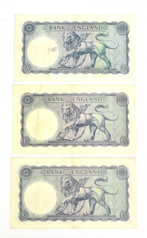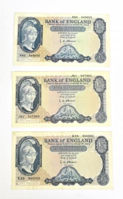 Lot 2544 of 2175: GREAT BRITIAN; three Bank of England L. K. O'Brien 5 notes S/N A93 549005, J61 547985 and K29 940282 (3).