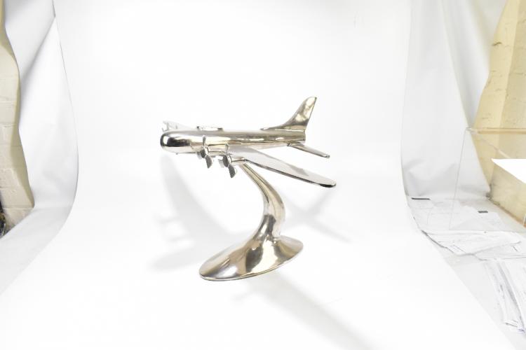 Lot 4 of 2475: A large chromed tabletop model aeroplane on oval base, height 42cm, width 80cm, depth 47cm.