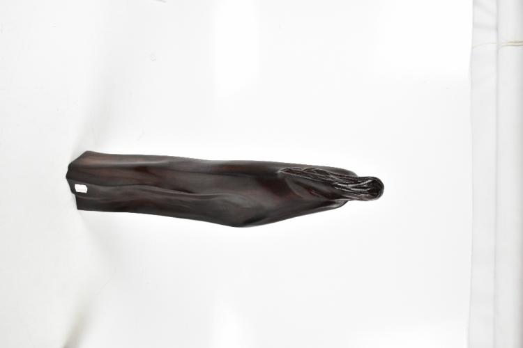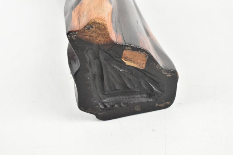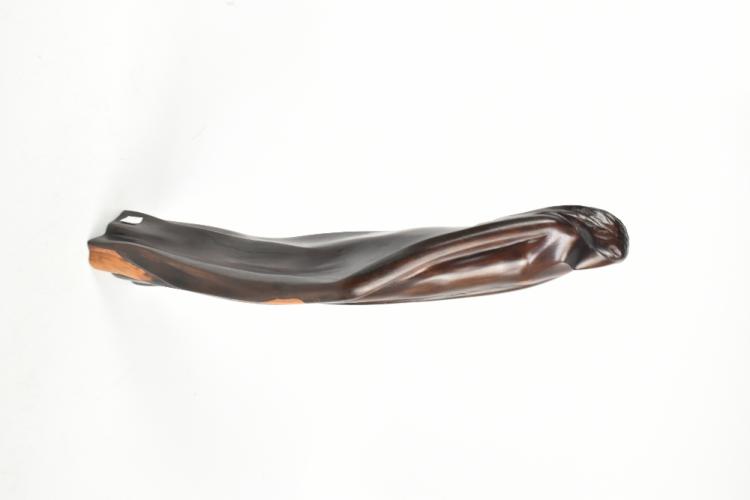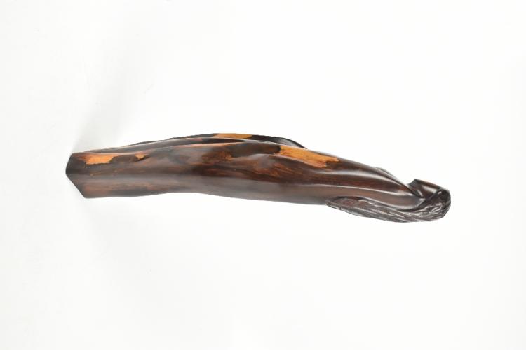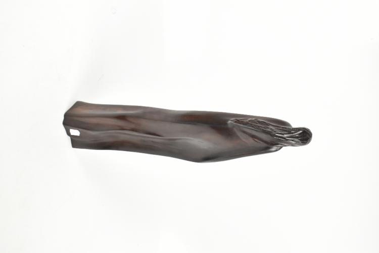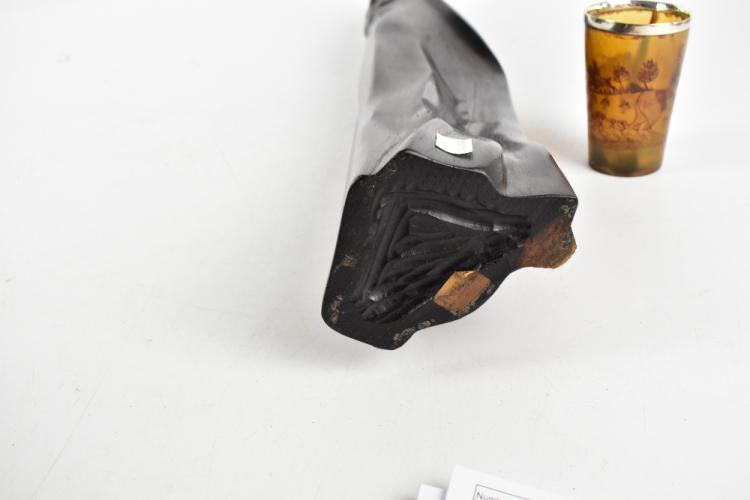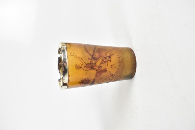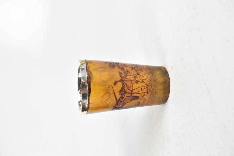 Lot 9 of 2475: A 19th century horn beaker decorated with a hunting scene, with white metal rim, height 10.5cm, together with a modern rosewood sculpture, apparently unsigned, height 58cm (2).
