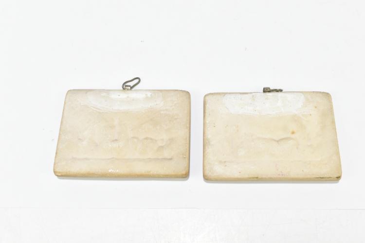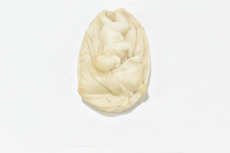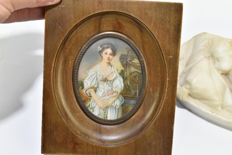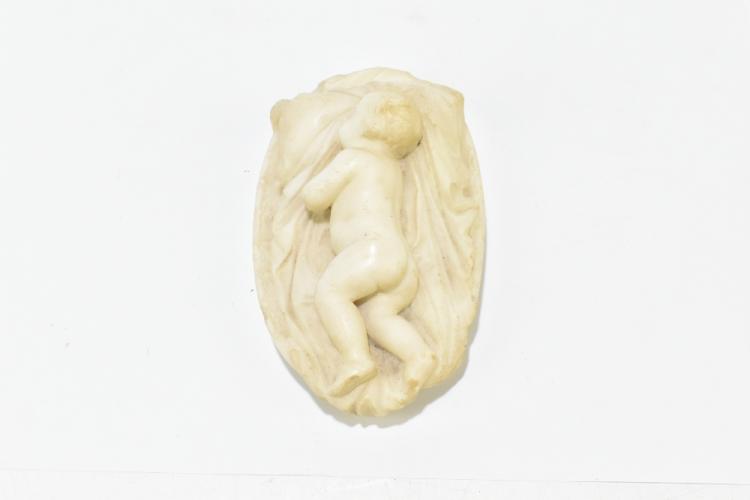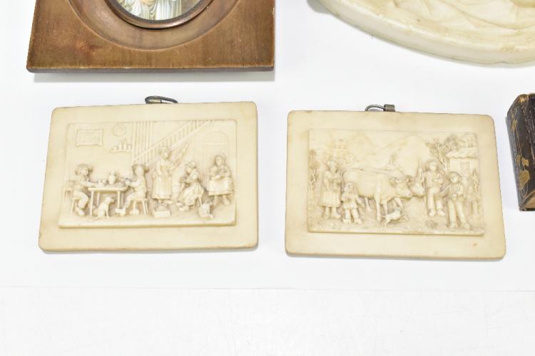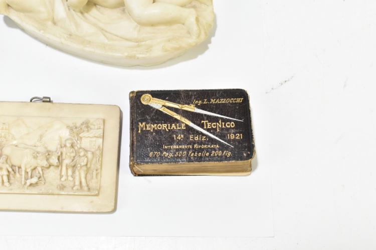 Lot 10 of 2475: A small white marble carving of a sleeping child, length 8.5cm, two relief plaques, a printed portrait miniature and a small book on technical instruments (5).