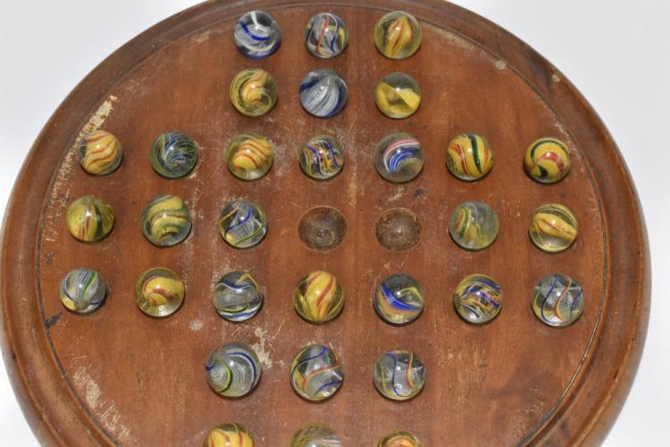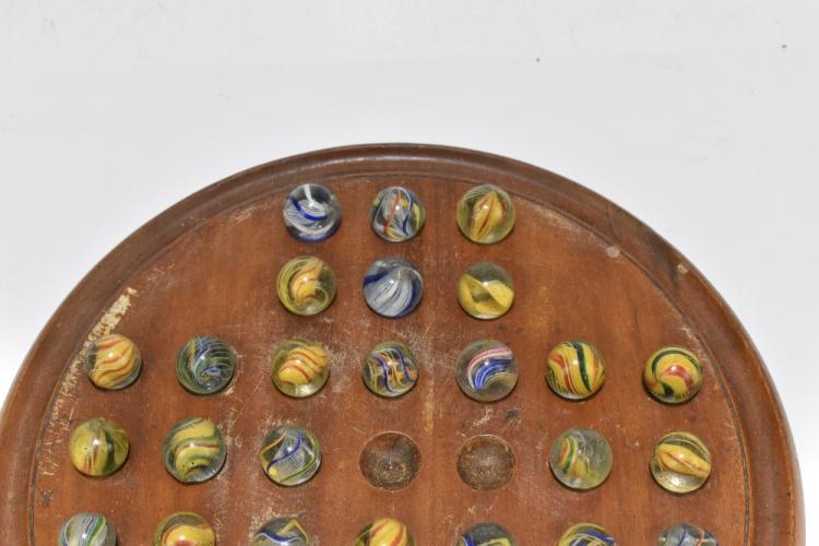 Lot 16 of 2475: A 19th century solitaire board housing thirty one 19th century marbles with internal swirls, each with pontil.