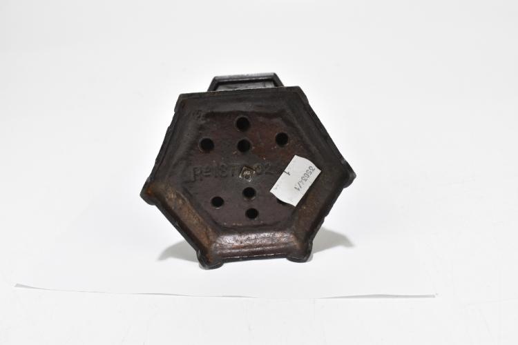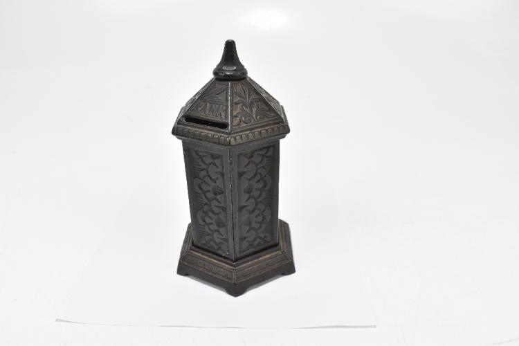 Lot 18 of 2475: A Victorian cast iron novelty money bank of hexagonal form, impressed registration number 187026 to base, height 16cm.