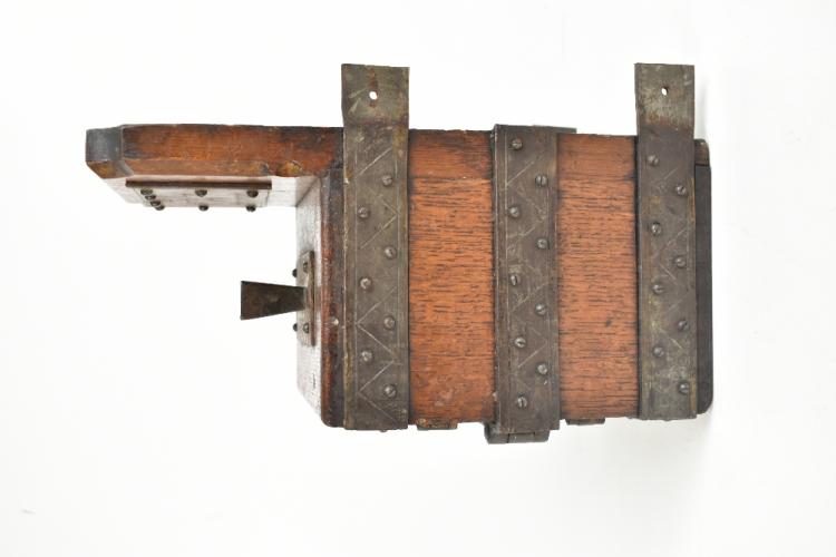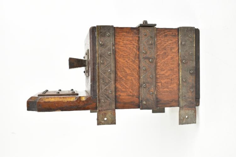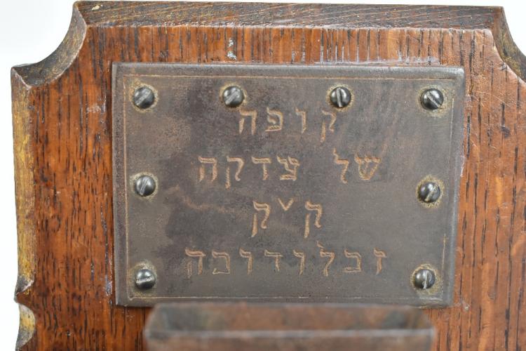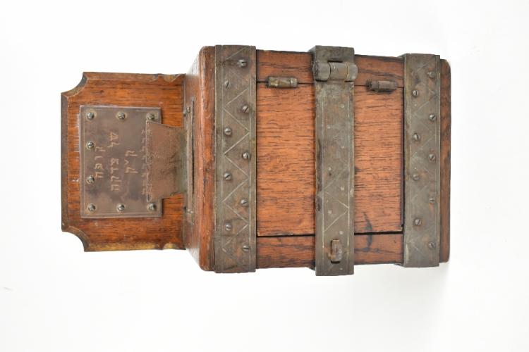 Lot 24 of 2475: JUDAICA; a late 19th/early 20th century Tzedakah (charity) box, the oak body with iron frame and hinged door beneath a plaque inscribed with the town of Zabludow (Bialystock Province, Poland), height 30.25cm. PROVENANCE: The vendor purchased the item at a Judaica and rare silverware auction in Tel Aviv, Israel. The box was previously owned by European Judaica and silverware collector Isy Halpern of Liege, Belgium. It is believed that the box was exhibited amongst other items at the Grand Curti
