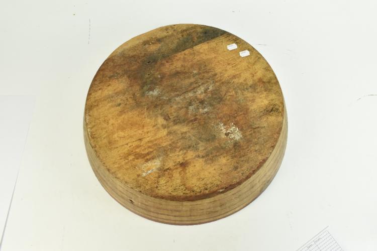 Lot 26 of 2475: A rustic treen dairy bowl of circular form with painted linear decoration, diameter 54cm.