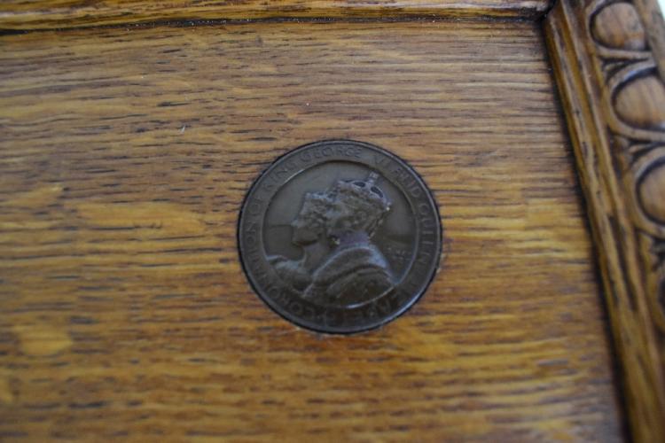 Lot 28 of 2475: An early 20th century oak serving tray with carved border and inset King George VI Coronation medallion, length 51cm.