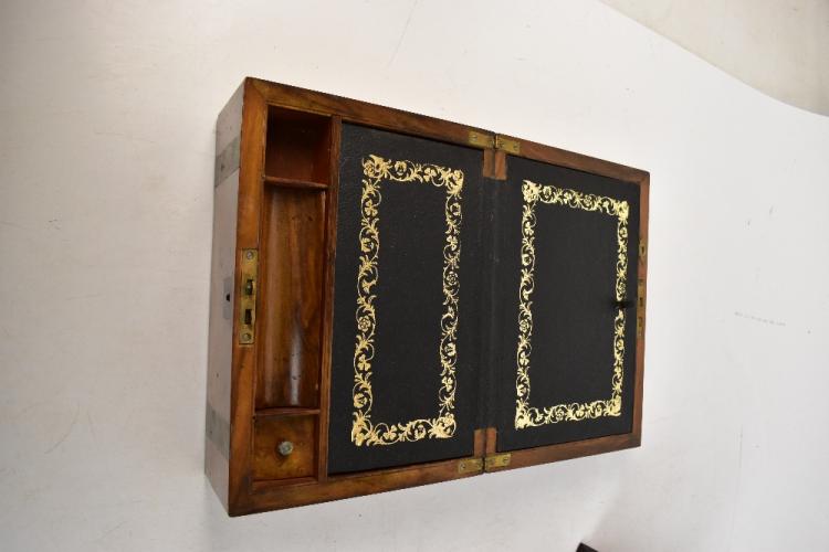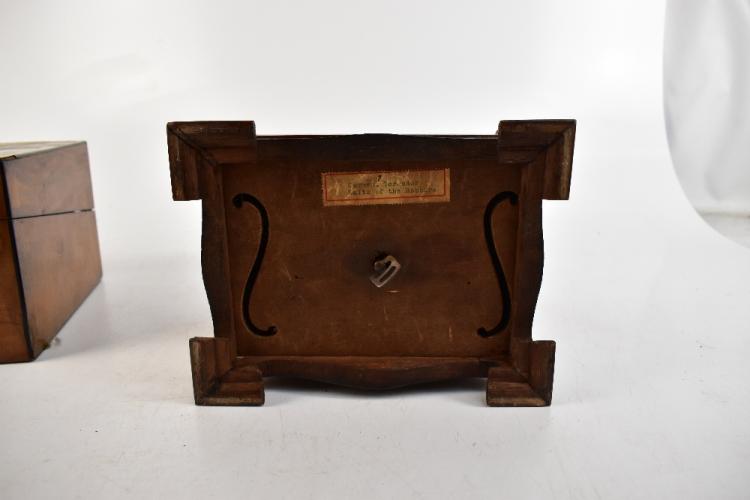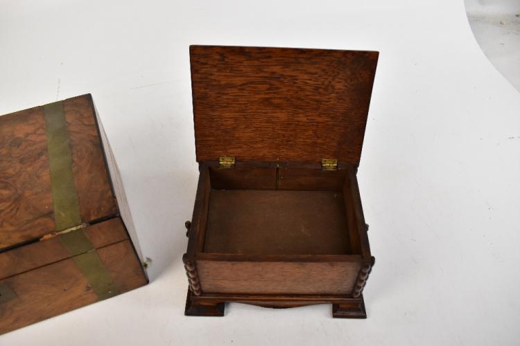 Lot 34 of 2475: A Victorian walnut metal bound writing slope with central shield shaped vacant cartouche, length 30cm, and an early 20th century oak musical box raised on splayed feet, length 22cm (2).