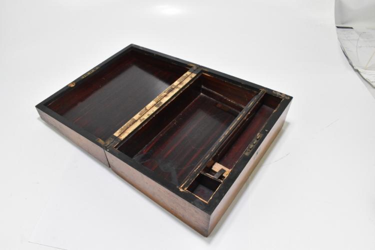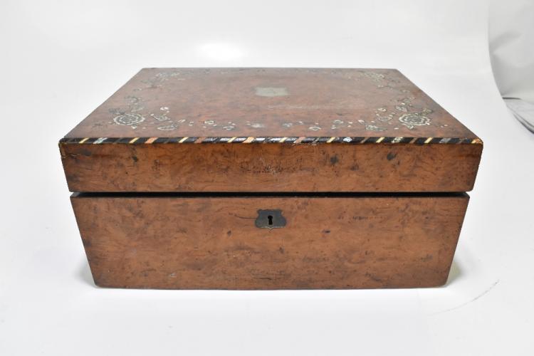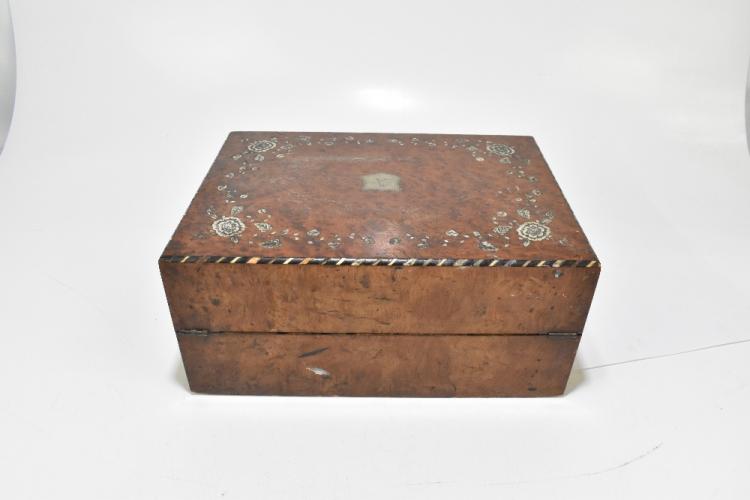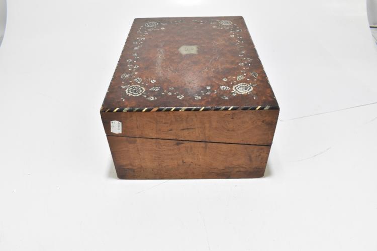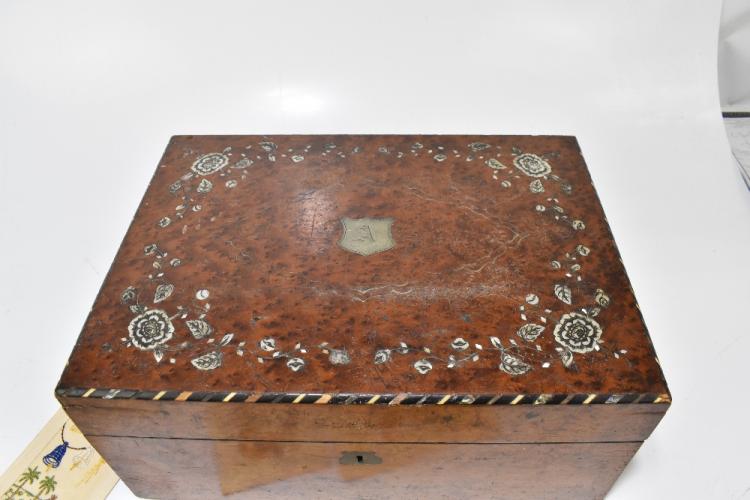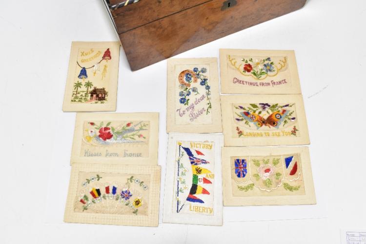 Lot 35 of 2475: A Victorian mother of pearl inlaid walnut writing slope, with central shield shaped cartouche with engraved initial A, length 36cm (af), together with eight WWI silk postcards (9).