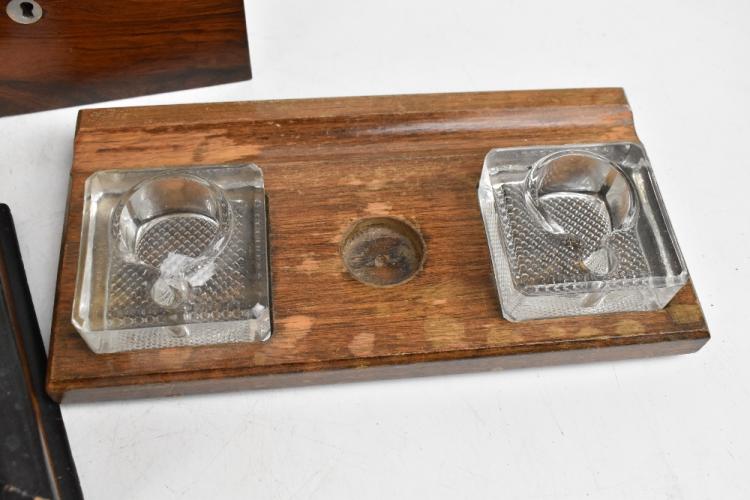 Lot 36 of 2475: A 19th century brass bound rosewood writing slope (af), length 35.5cm, together with a rosewood tea caddy, two desk stands with glass inkwells, cased set of drawing implements, etc.