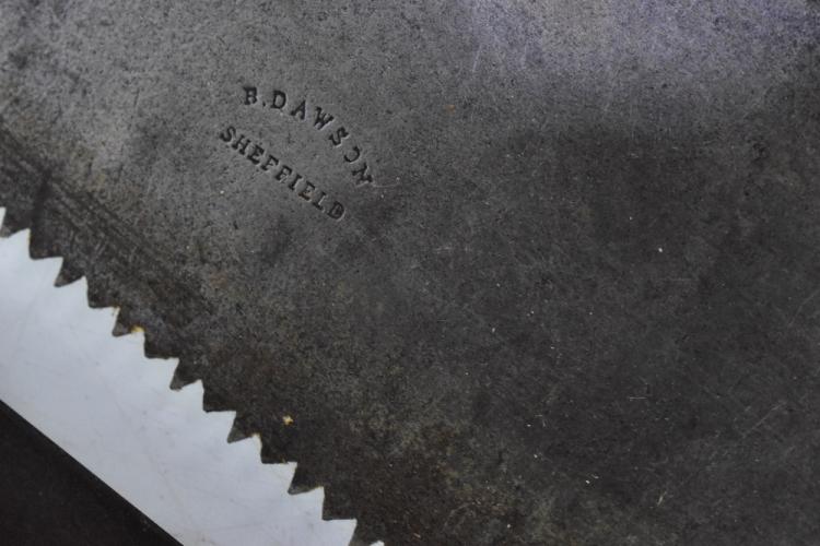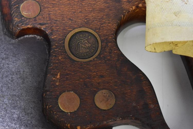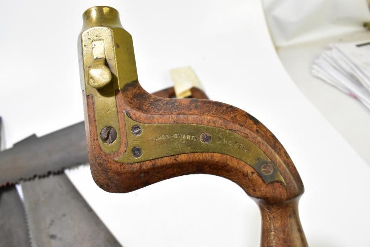 Lot 49 of 2475: JAMES HOWARD OF SHEFFIELD; a 19th century brass mounted brace, length 35cm, together with five assorted rip saws (6).