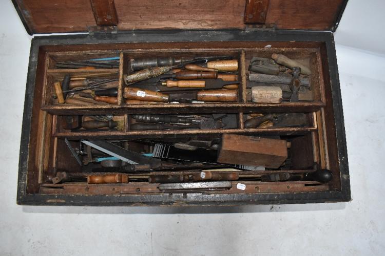 Lot 50 of 2475: An old stained pine tool chest housing a large collection of assorted antique and later tools.