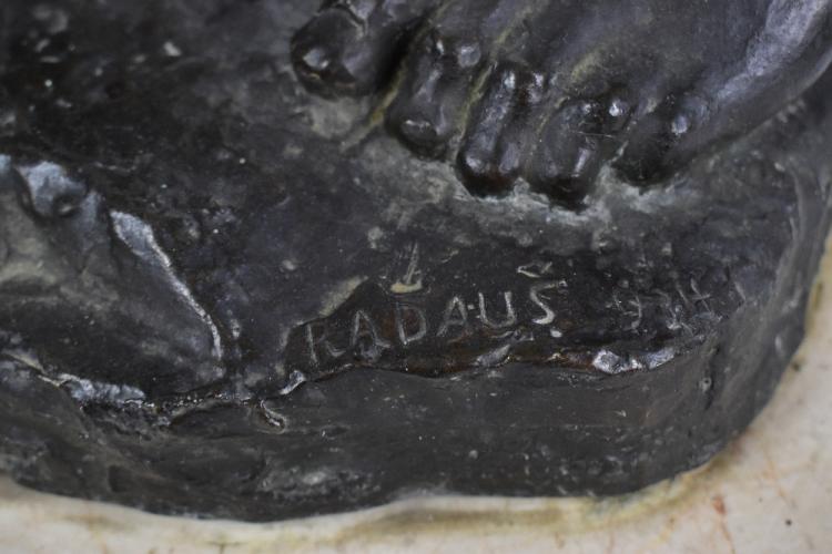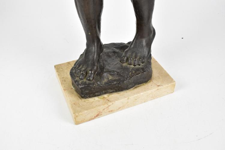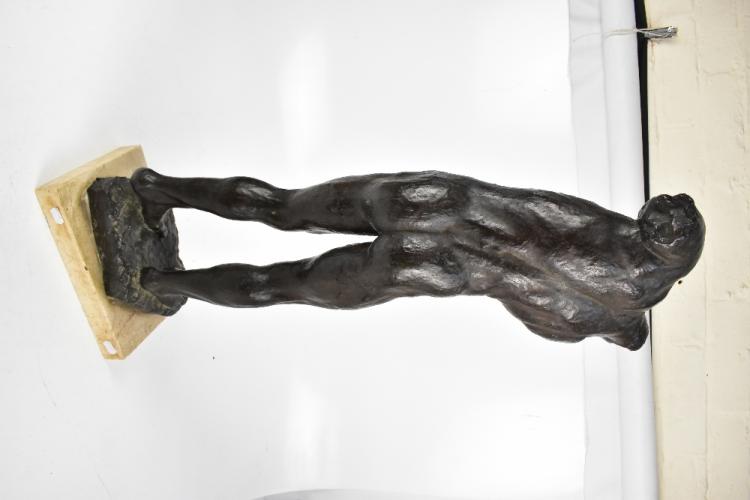 Lot 55 of 2475: VANJA RADAUS (Croatian 1906-1975); a large bronze sculpture, 'Kosac (The Reaper)', male nude, raised on a rectangular marble plinth, cast by Fanjo Antolic, signed and dated 1934, and inscribed 'Ljevao-Antolic' height including base 88cm. (D) The vendor's great uncle, Professor Valecic, sent the bronze from Zagreb in 1977 to the vendor's father. We would like to thank Bozidar Pejkovic of the Augustincic Collection in Klanjec for his assistance with cataloguing this lot.