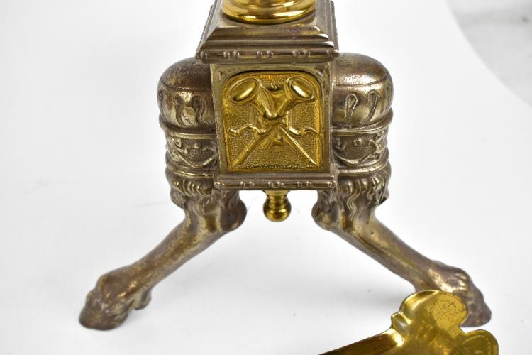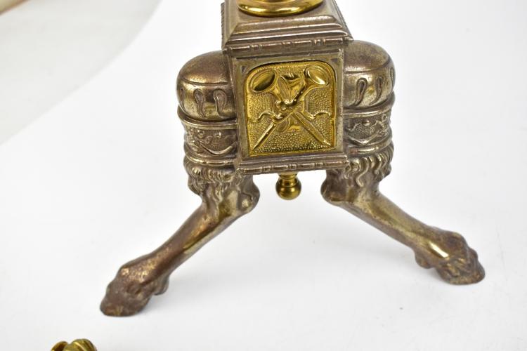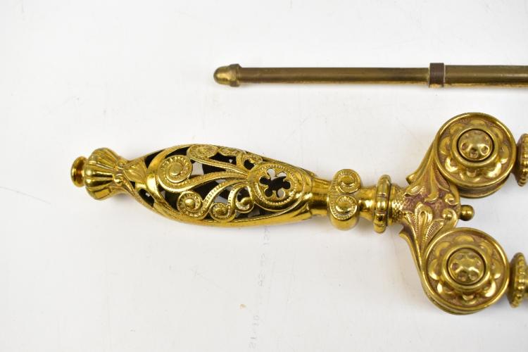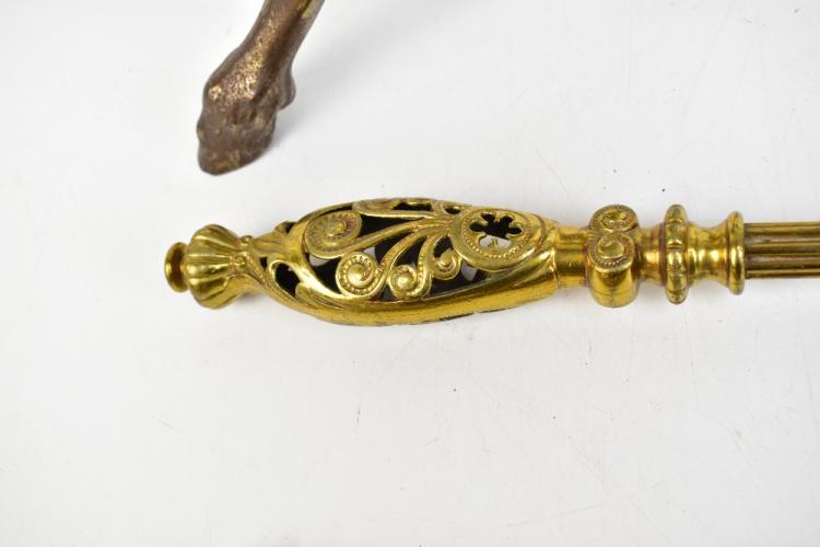 Lot 70 of 2475: A pair of late 19th century Adam-style brass fire dogs, both with Classical urns with ring handles, above outswept hoof feet, height 46cm, also a good late 19th century brass three-piece companion set (5).