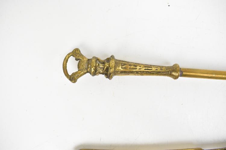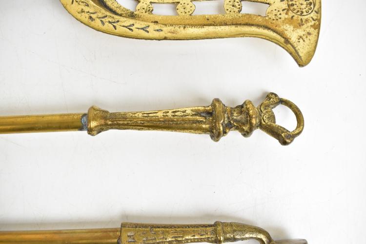 Lot 75 of 2475: A set of three 19th century brass fire irons comprising poker, tongs and pierced shovel with urn design.