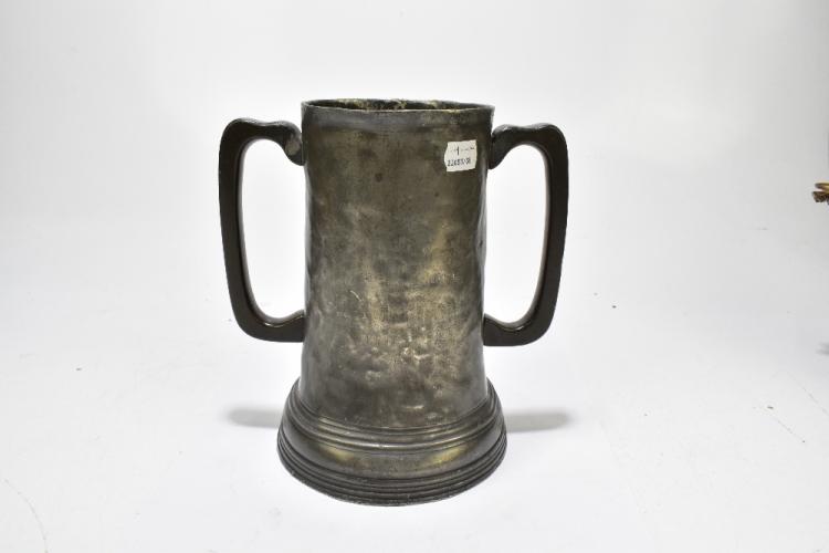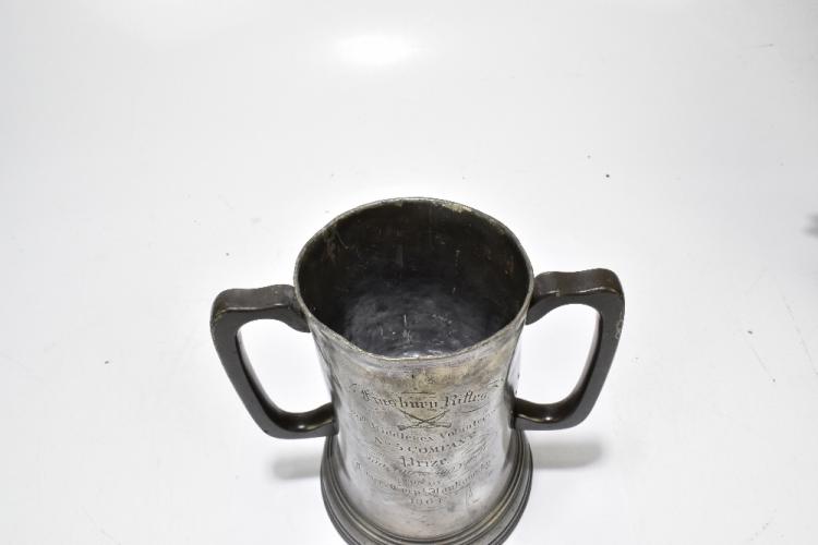 Lot 79 of 2475: FINSBURY RIFLES INTEREST; a 19th century pewter loving cup inscribed 'Finsbury Rifles 39th Middlesex Volunteers No.5 Company Prize 200 400 & 500 yards won by Lance Corporal Yankoroski 1864', with glass bottom, height 23cm.