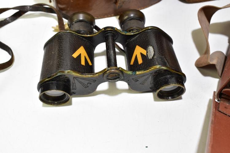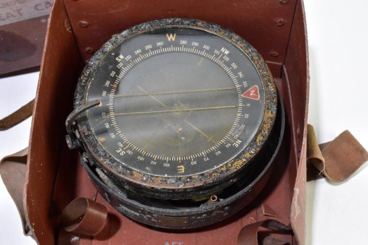 Lot 80 of 2475: A WWII period cased military type P.10 binnacle compass, diameter 18.5cm, fitted in original cardboard box with numerous stamps to the interior to include 'Examined 17th March 1942, Manchester', together with a cased set of military binoculars stamped 'A.Kershaw &  Sons Ltd, Leeds' (2).