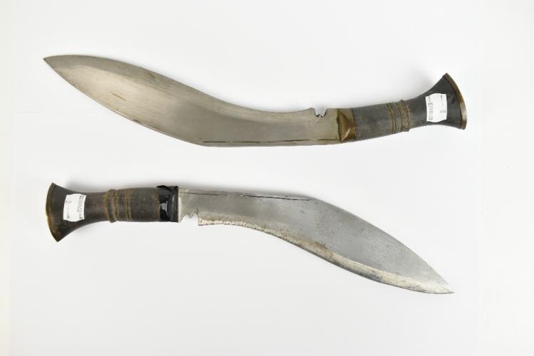 Lot 82 of 2475: Two Gurkha Kukri knives of typical form in leather scabbards, and with stained handles and each with two smaller knives secreted to the upper section of the scabbard, length 40cm.