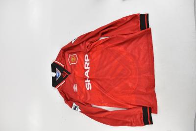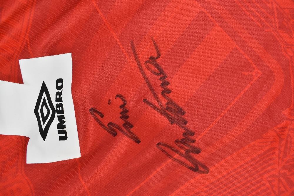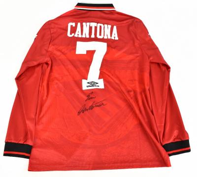 Lot 106 of 2475: ERIC CANTONA; a Manchester United Umbro 1994-96 season retro remake long sleeved home shirt with Premier League badges to shoulders, signed with 'Cantona 7' printing to reverse, size XL.