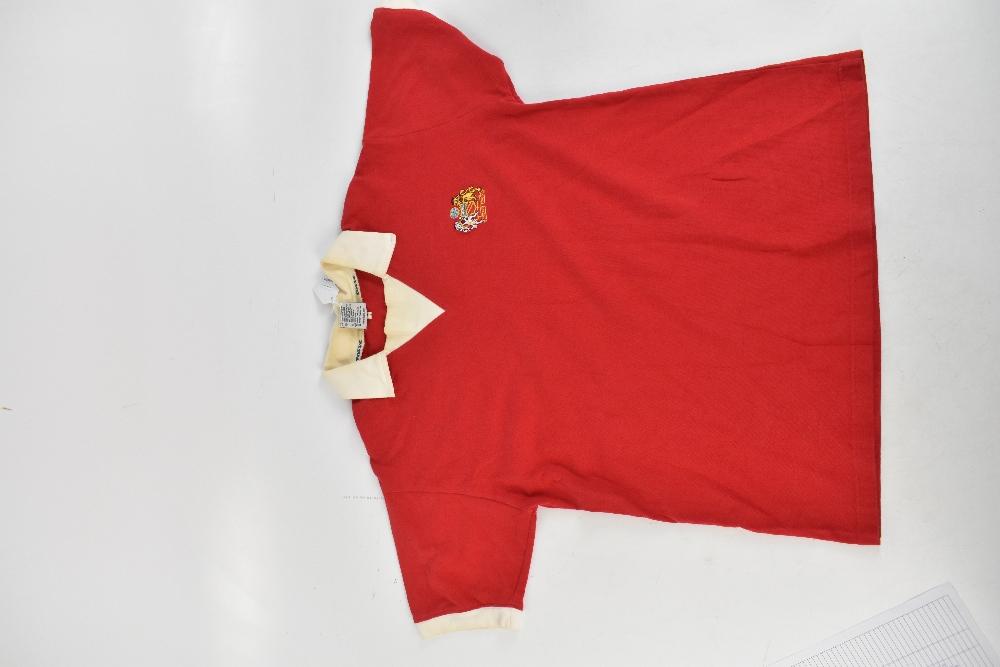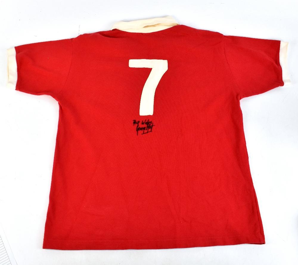 Lot 113 of 2475: GEORGE BEST; a Toffs retro remake Manchester United 1970s-style home shirt with embroidered badge, signed and further inscribed 'Best wishes' with embroidered 7 to reverse, size L.