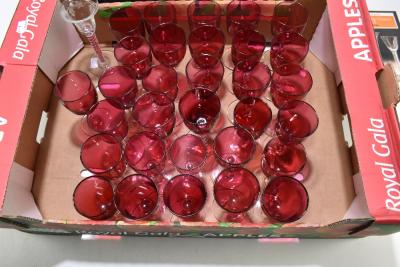 Lot 320 of 2475: A suite of Victorian and later coloured glassware, to include flasks, also a Georgian style wine glass with air twist stem (84).
