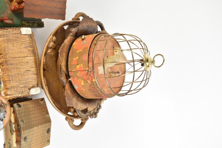 Lot 336 of 2475: Four Black Forest type musical carved wooden bowls, some with labels detailing Swiss movements, diameter of largest 32.5cm, five further examples modelled as traditional houses including an Isle of Man cottage example, marked 'A Kelly Souvenir, Jurby' to base, and a further group of musical box movements, also a bird in cage automaton type example.