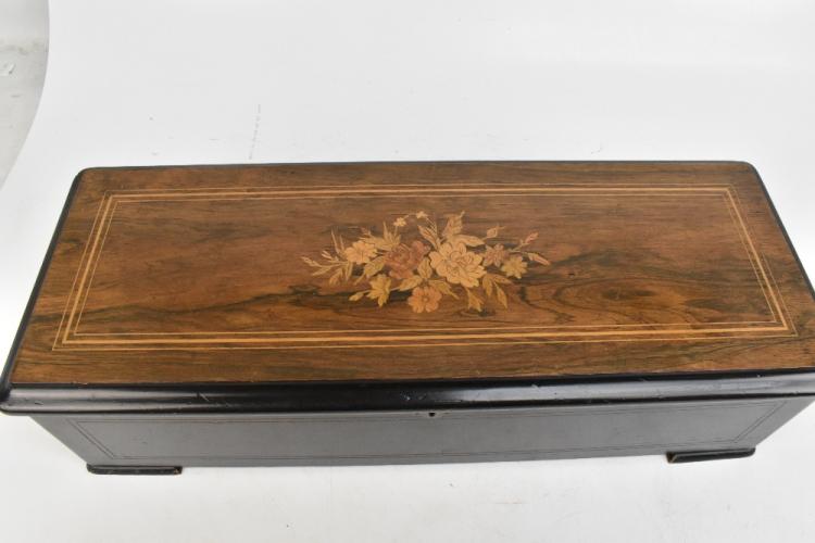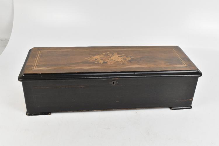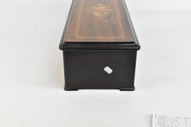 Lot 340 of 2475: PVF STE CROIX; a late 19th century Swiss walnut cased twelve air musical box, the hinged lid with floral marquetry decoration, retaining original paper label detailing the twelve tunes to the interior, the movement no.78398, the case 16.6 x 63 x 22.5cm.