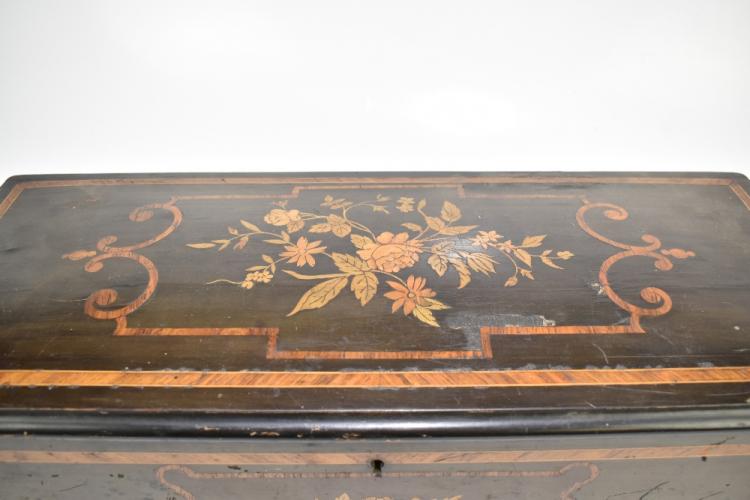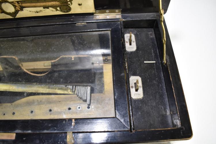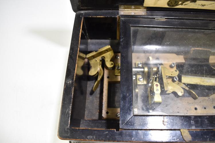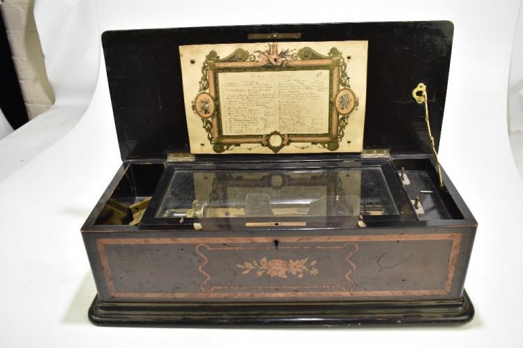 Lot 346 of 2475: A late 19th century walnut and inlaid cased part musical box, the lid with thirty six air list above glazed door enclosing a partial movement (in pieces lacking main barrel and other sections and with floral decorated case), width 57cm (af).