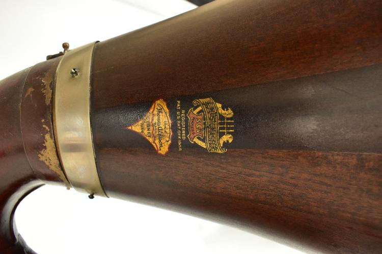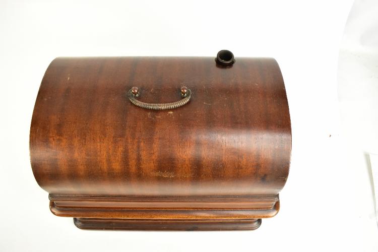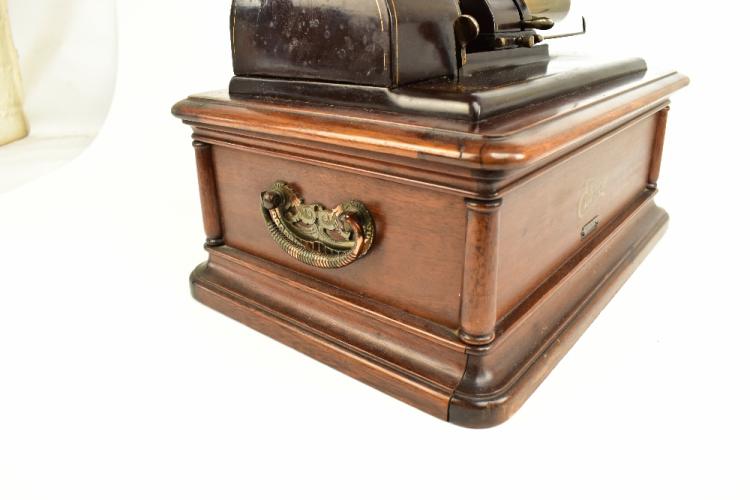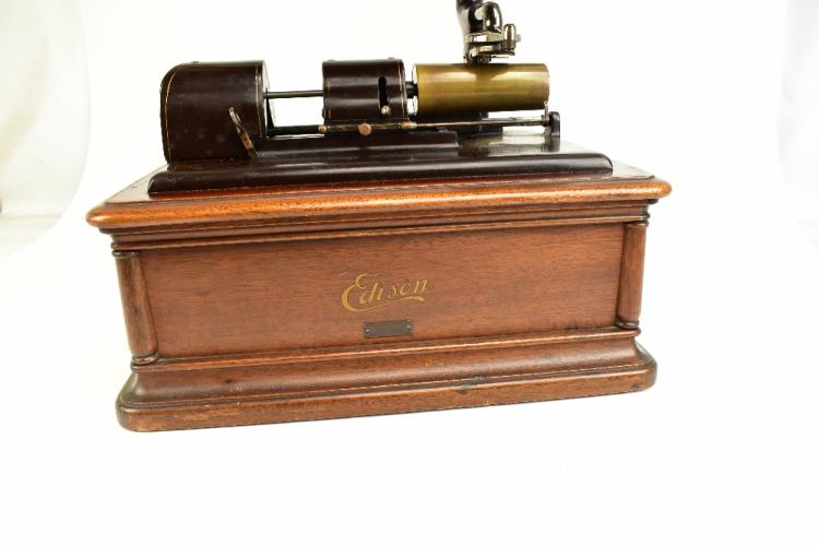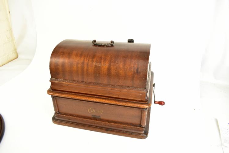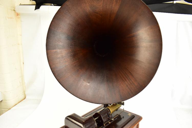 Lot 349 of 2475: EDISON; a rare 'Opera' phonograph, with applied manufacturer's plaque Type S M, Model A, serial number 1711, the mahogany case with twin applied copper plated scroll motif handles, the mahogany horn with gilt label 'Music Master S&V Makers Registered PAT.U.S.PAT.OFF.1908 Thomas A Edison Trademark Cygnet "PAD'D"', the case further labelled 'Edison' in gilt to front above applied plaque inscribed 'Jake Graham [...] Gramophones 76 & 76A Renshaw St. Liverpool', horn diameter 53.5cm, horn length 56.5