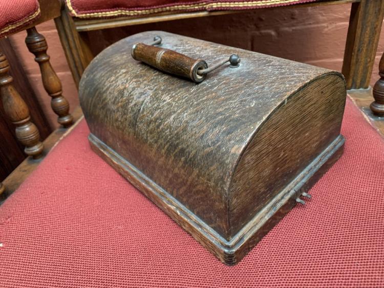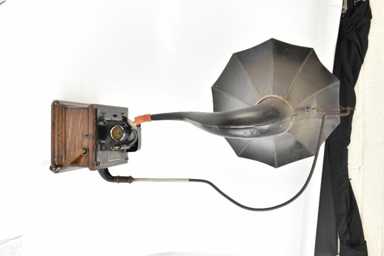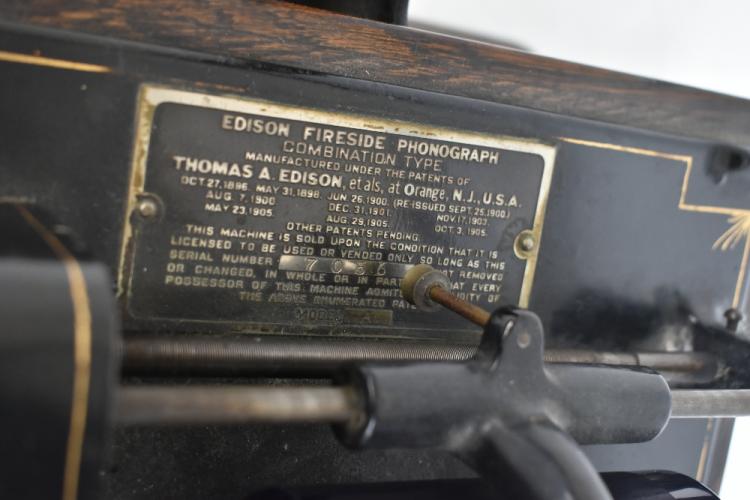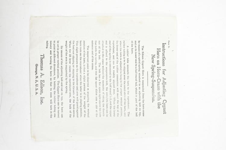 Lot 350 of 2475: EDISON; a Model A Fireside two-speed combination model phonograph, serial no.7056, the reproducer with stamped marks ‘[...] sold by Nat’l Phono. Co.’, the decagonal Cygnet horn on horn-crane with spring suspension, in oak case with lid, height with horn attached 91cm, accompanied by a copy of 'Instructions for Adjusting Cygnet Horn on Horn-Crane with the New Spring-Suspension' leaflet. Provenance: The Norman Roland Collection of Mechanical Music.