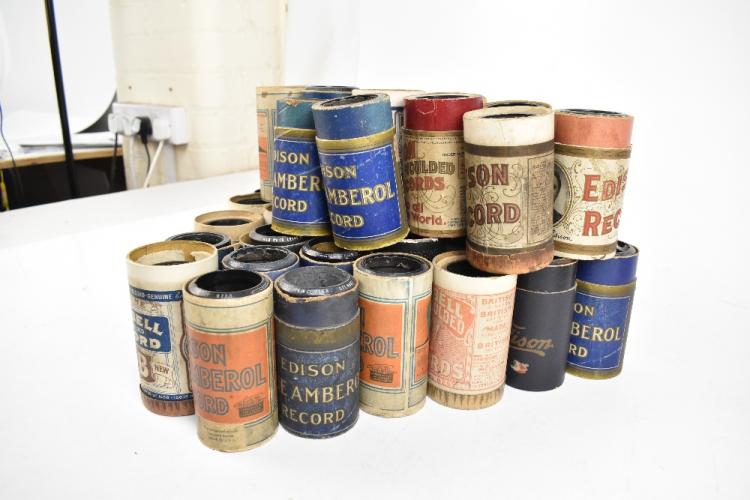 Lot 355 of 2475: Approximately forty music cylinders of mixed manufacture in lidless boxes, predominantly Edison blue Amberols, with further Sterling examples, artists including Harry Lauder, George Formby, Kirwan & Hindermeyer, Florrie Forde, etc. Provenance: The Norman Roland Collection of Mechanical Music.