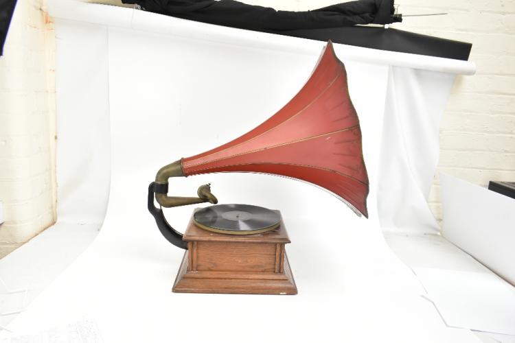Lot 363 of 2475: HMV; an oak cased Zonophone, the reproducer marked for International Zonophone Company, the case 18 x 39 x 39cm, with red tin horn, length approx 60cm, diameter 58.6cm. Provenance: The Norman Roland Collection of Mechanical Music.