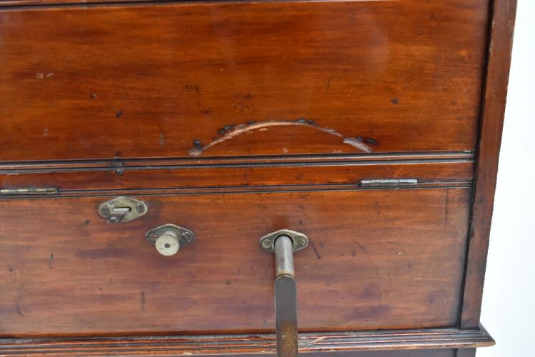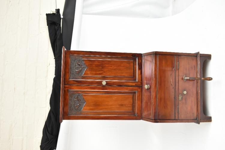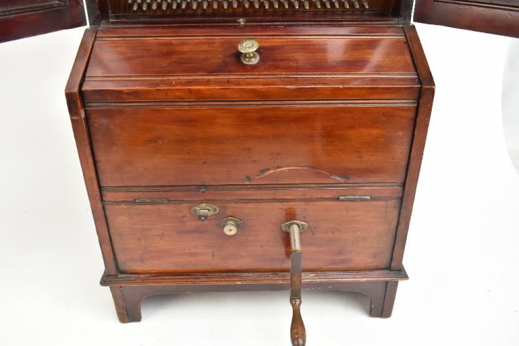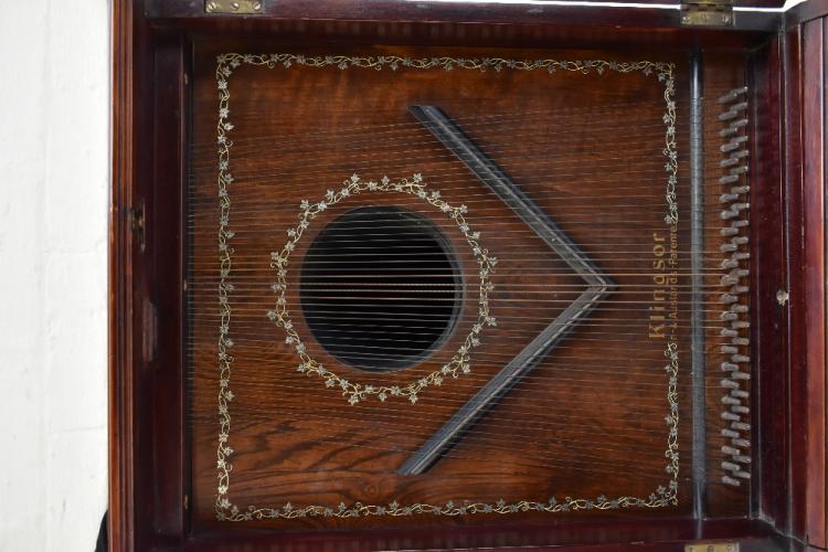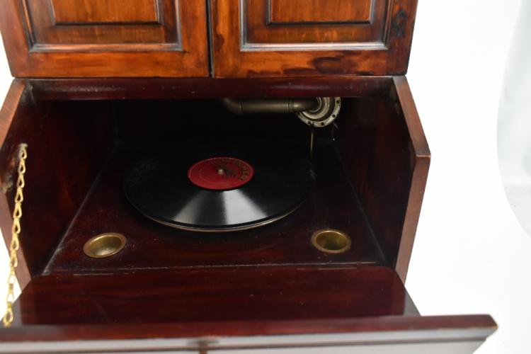 Lot 372 of 2475: KREBS & KLENK OF HANAU, GERMANY; a Klingsor gramophone in mahogany case, featuring a set of strings across the mouth of the internal horn, believed to be pre-WWI, the reproducer marked 'Klingsor D.R. Patent', with internal gilt detail and manufacturer's mark 'Klingsor In - & Auslands A-Patente', the twin panelled doors with carved detail, raised on bracket feet, height 84cm, width 42.5cm, depth 38cm. Provenance: The Norman Roland Collection of Mechanical Music.