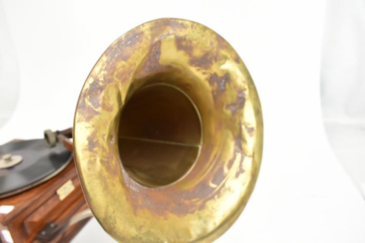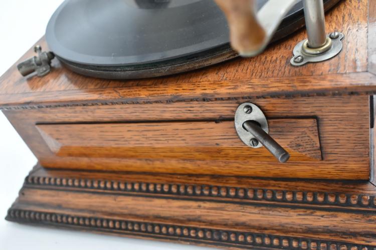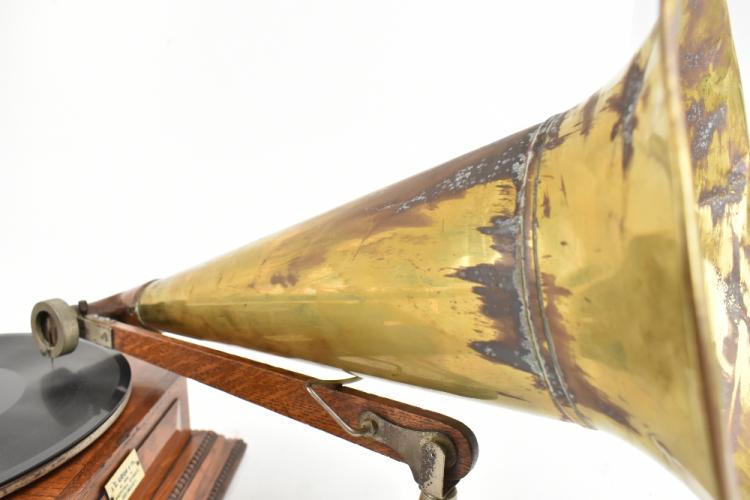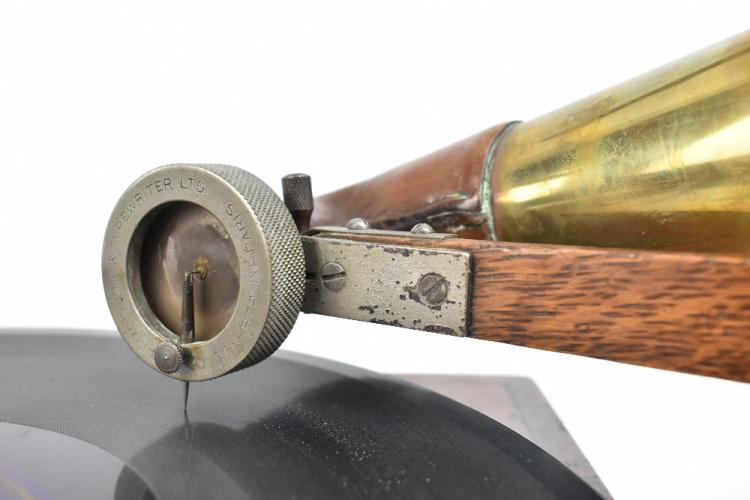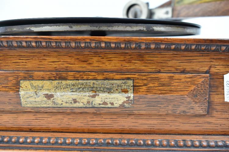 Lot 374 of 2475: GRAMOPHONE & TYPEWRITER LTD; a New Style No.4 top wind horn gramophone, circa 1904, in panelled oak case with original applied gilt label for The Gramophone & Typewriter Ltd Company, the concert soundbox stamped 'Gramophone & Typewriter Ltd London - Berlin - Paris', with later applied dealer's plaque for J. Gibson & Co Grimsby, with associated clear glass case. Provenance: The Norman Roland Collection of Mechanical Music.