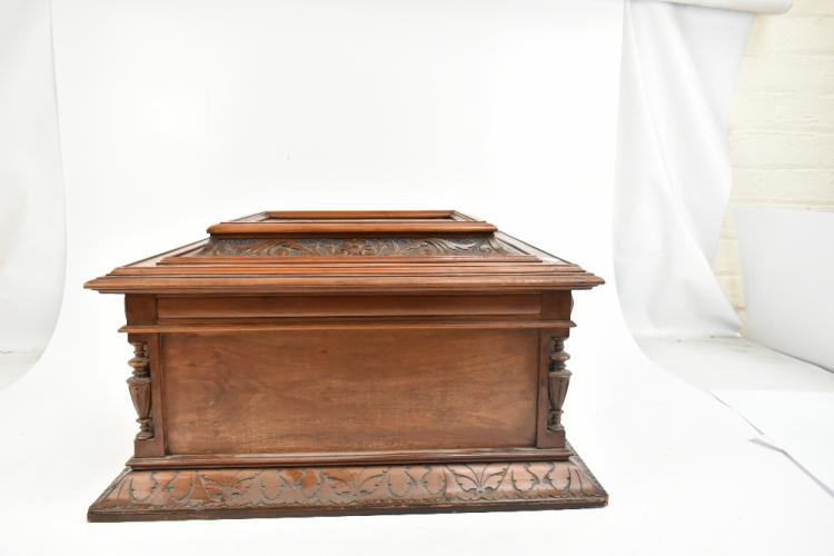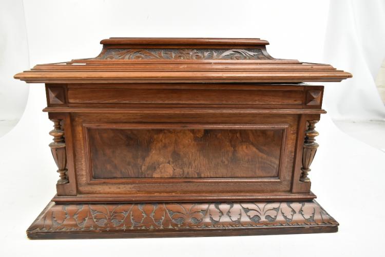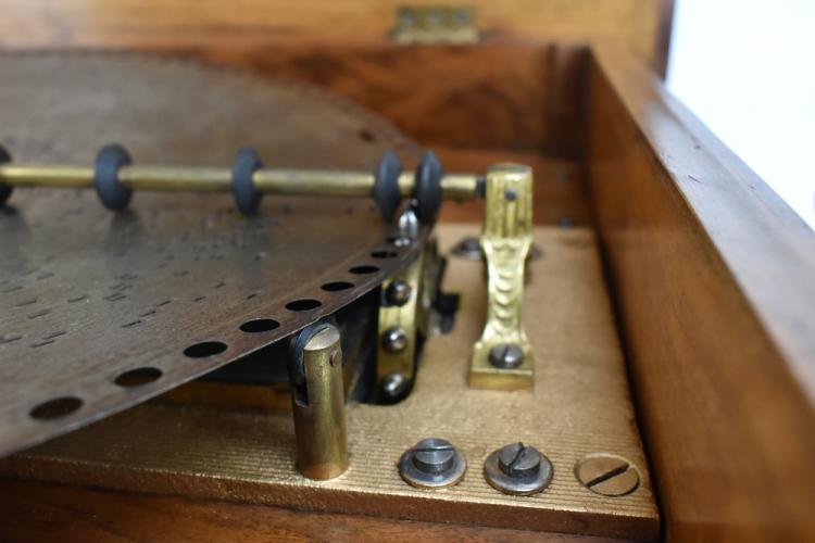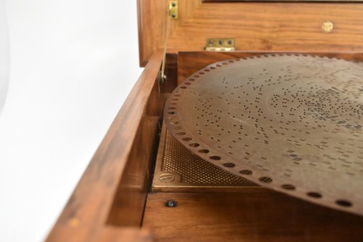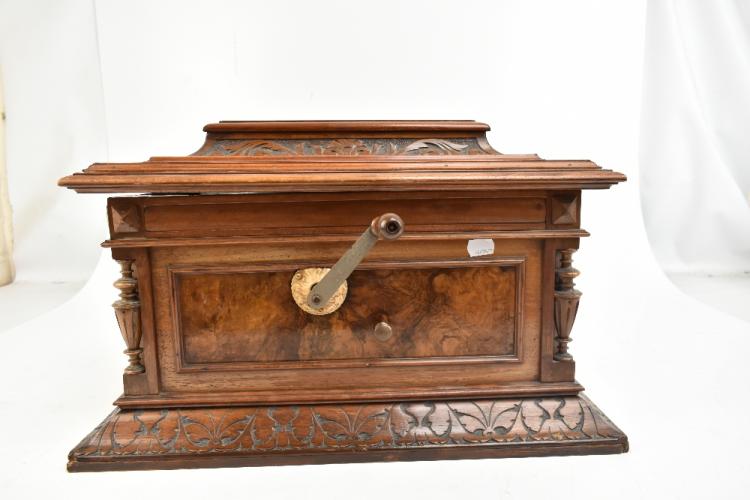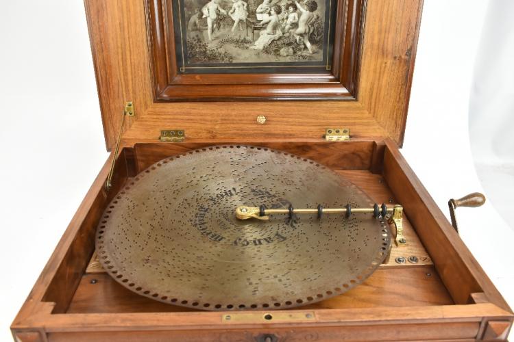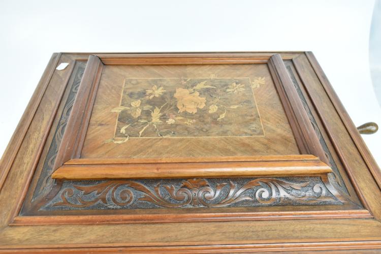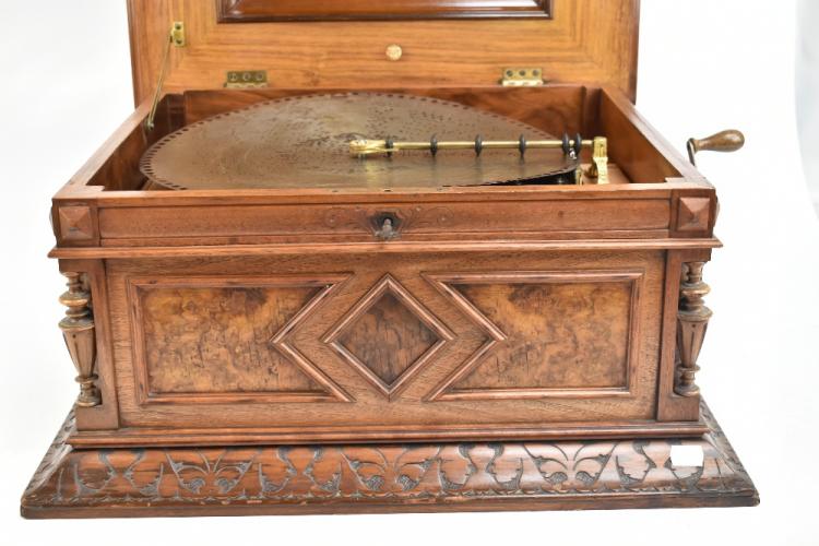 Lot 377 of 2475: A Style 45 coin-free table top 15 1/2" disc Polyphon musical box in carved walnut and burr walnut case with floral marquetry detail to top, the lid interior inset with monochrome print depicting putti playing instruments and dancing to music, further inset with ivory/ivorine retailer's plaque inscribed 'Joseph Riley & Sons Constitution Hill Birmingham', the case when closed 31.5 x 57 x 51.5cm, sold with five 15 1/2" discs comprising 'Couplet Anglais', 'My Gal is a High Born Lady', 'The Geisha' b