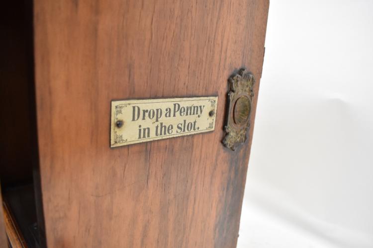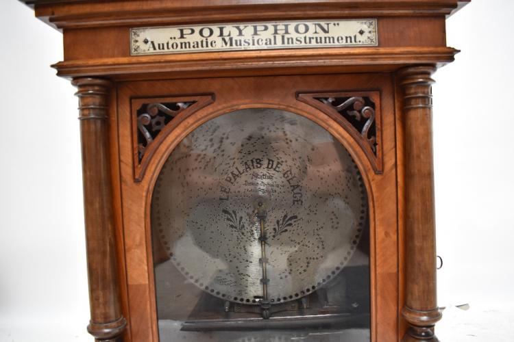 Lot 379 of 2475: An upright coin-in-the-slot 15 1/2" Polyphon musical box in oak and walnut case, made in Leipzig, with applied plaque to front inscribed '"Polyphon" Automatic Musical Instrument' and to both sides 'Drop a Penny in the Slot', the glazed and pierced door flanked by turned columns, raised on knopped feet, height 90.5cm, width 61.5cm, depth 37.5cm, accompanied by five 15 1/2" musical discs comprising 'Le Palais de Glace Skating' by J. Sallée-Viard, 'Floradora The Silver Star of Love' by Leslie Stuar