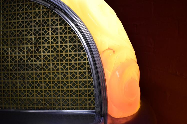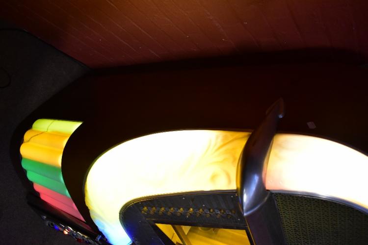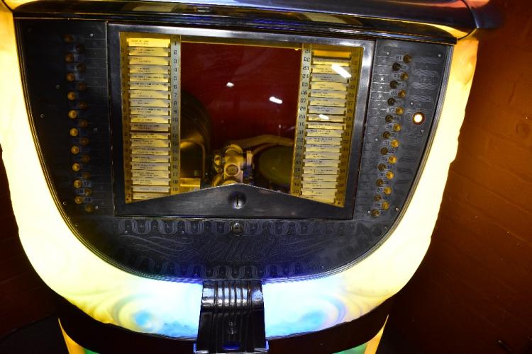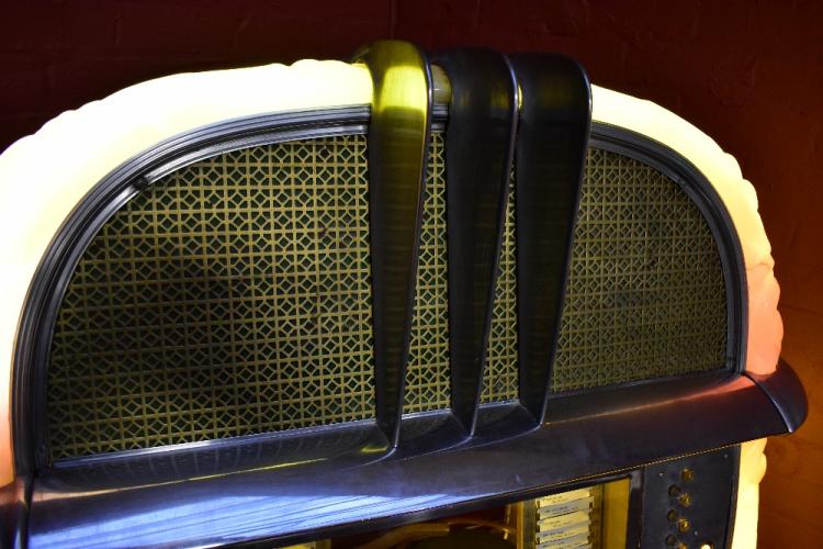 Lot 383 of 2475: AMI; a 'Mother of Plastic' Model A jukebox in Art Deco style case with streamlined details and coloured light tubes, playing forty 78rpm records, height 172cm, width 100cm, depth 65cm (af); offered with a selection of 78 records. Provenance: The Norman Roland Collection of Mechanical Music.