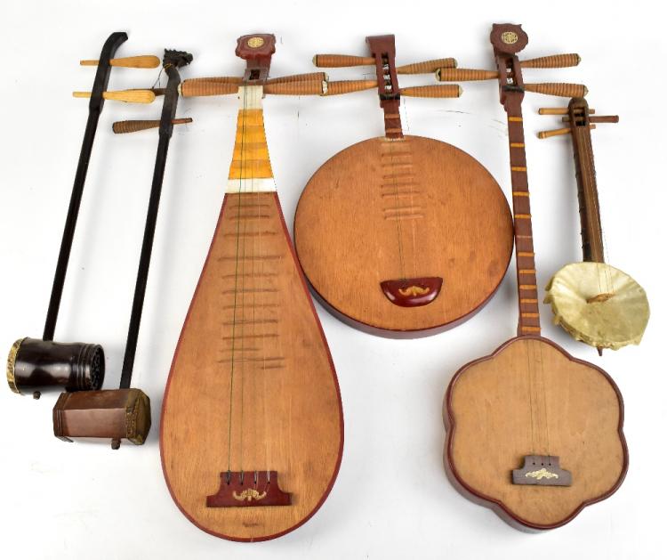 Lot 405 of 2475: Three Chinese lutes comprising two Sanxian and one Yueqin, also two erhu (spike fiddle) and a kamaicha (6).