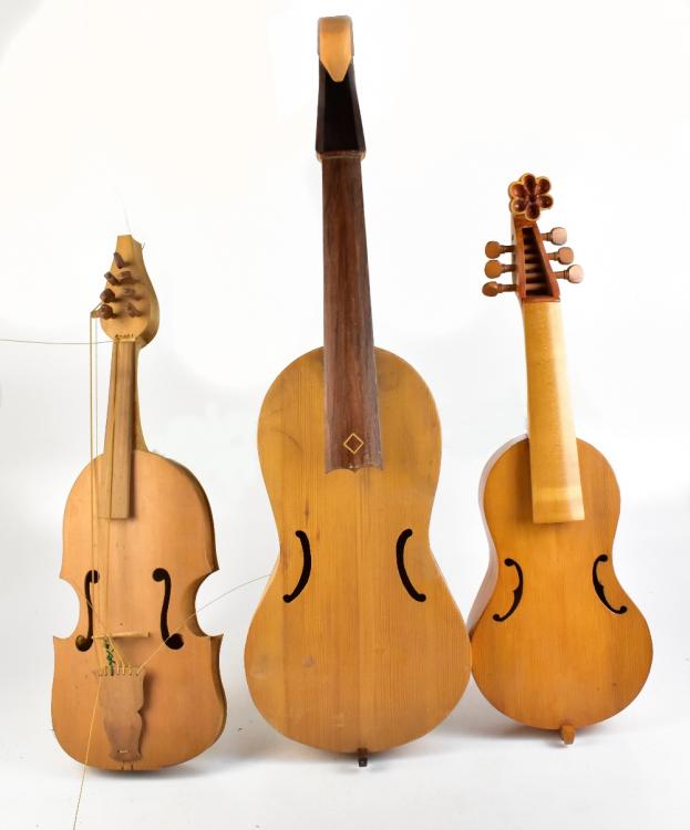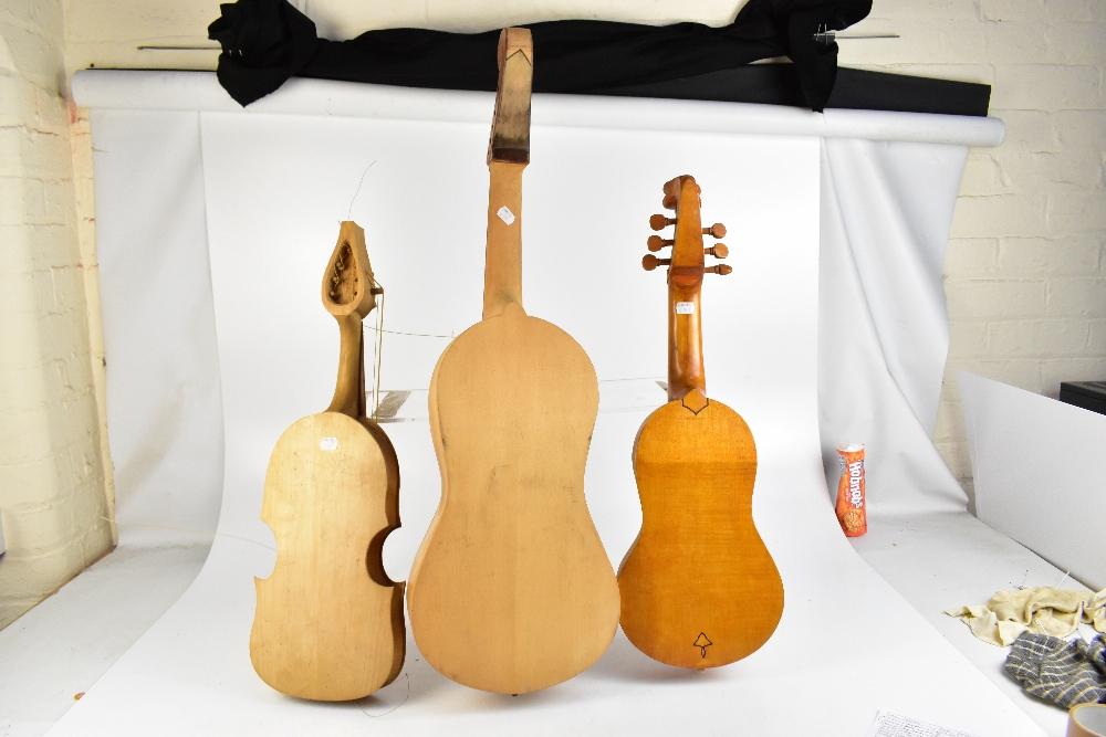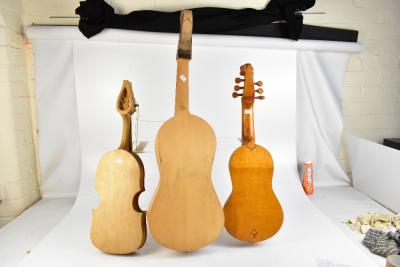 Lot 415 of 2475: Three assorted viols for finishing, lengths 65cm, 67cm and 88cm.
