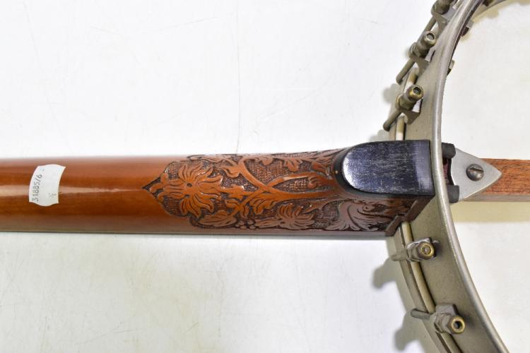Lot 422 of 2475: SS STEWART, PHILADELPHIA; a late 19th century five-sting banjo with mother of pearl inlay and carved decoration, applied ivorine label verso 'SS Stewart PHIL'A, PA', length 98cm.