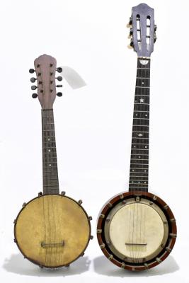 Lot 434 of 2475: SS STEWART, PHILIDELPHIA; an early 20th century banjo/mandolin, length 56cm, also a small unnamed five-string banjo with sunburst line inlay to back (2).