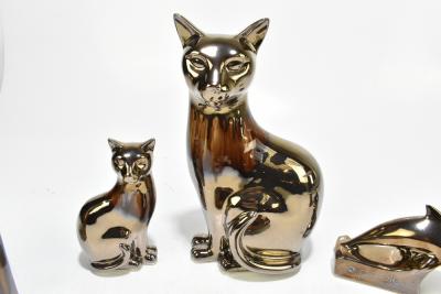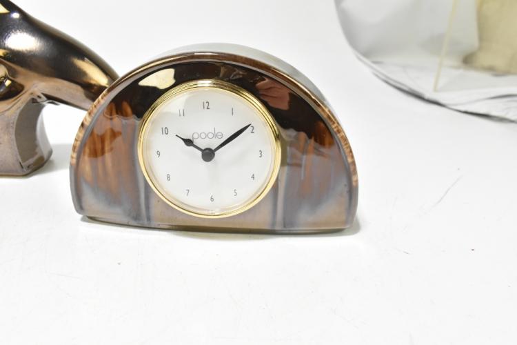 Lot 1109 of 2475: POOLE POTTERY; six pieces decorated in a bronze/brown glaze, to include a large flat back cat, height 30cm, two mantel clocks, etc (6).