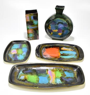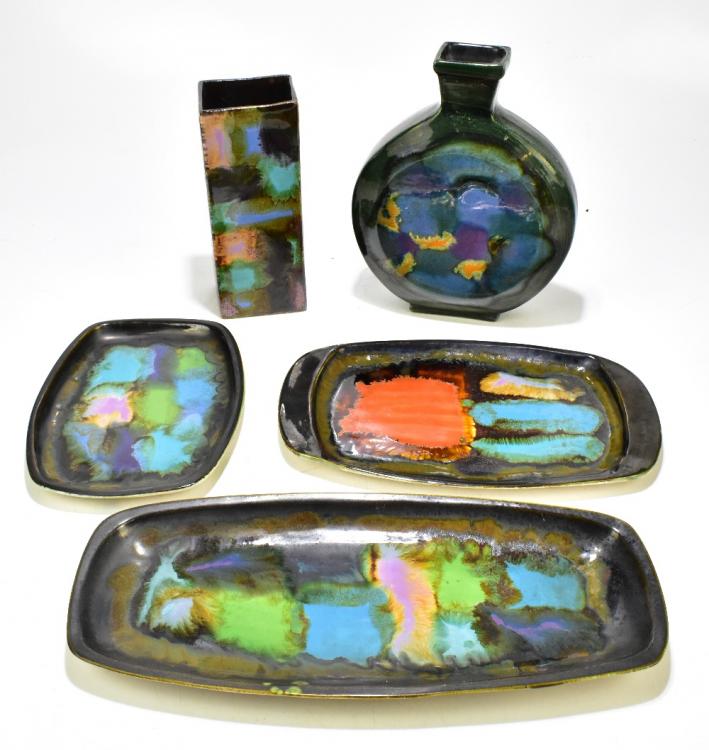 Lot 1167 of 2475: ERIC LEAPER; five pieces of assorted ceramics to include a moon flask, height 29cm, rectangular platters (5). (D)