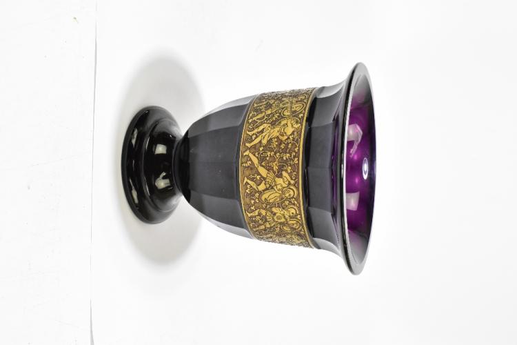 Lot 1262 of 2475: MOSER; a large 'Karlsbad' amethyst glass vase with panelled decoration and a central gilt band depicting a battle scene, signed to base, height 20.2cm.