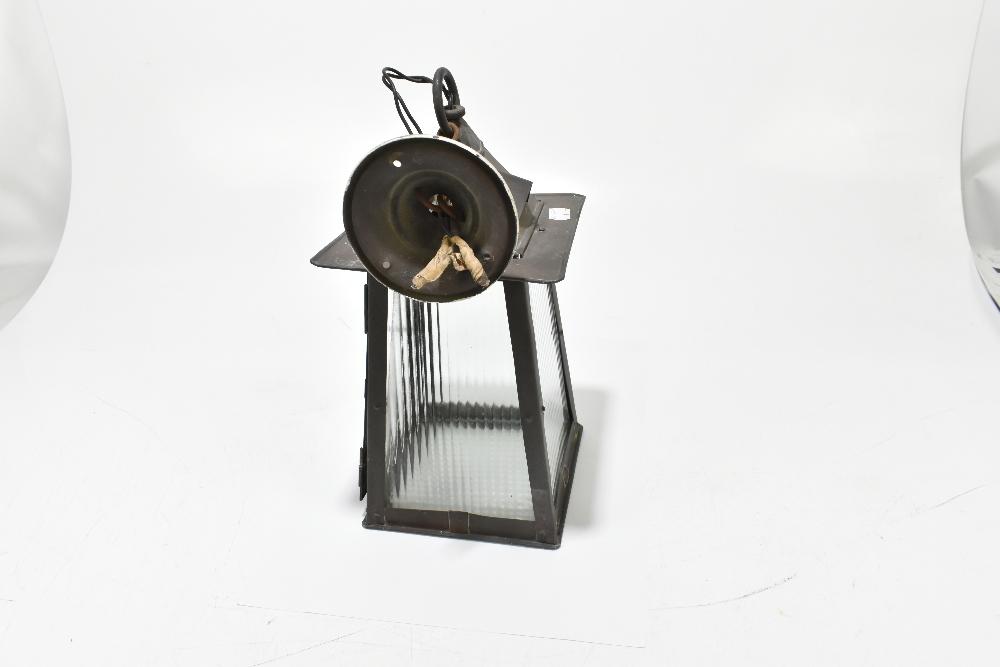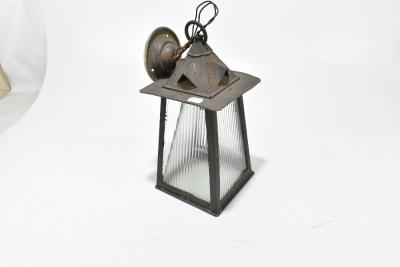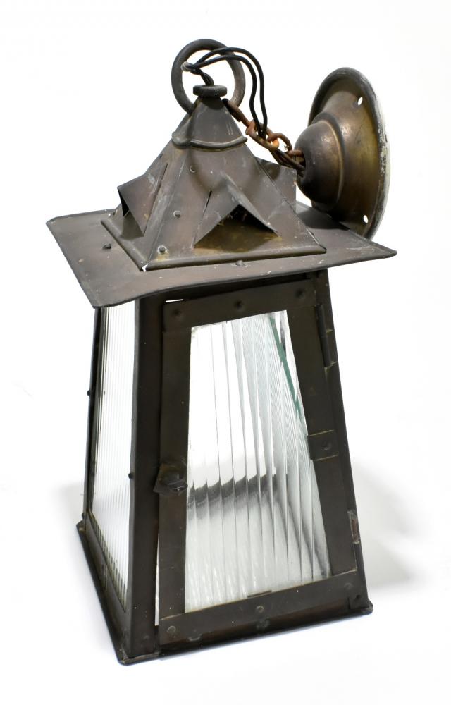 Lot 1304 of 2475: An Arts and Crafts copper plate lantern with four moulded clear glass panels, height 34cm.