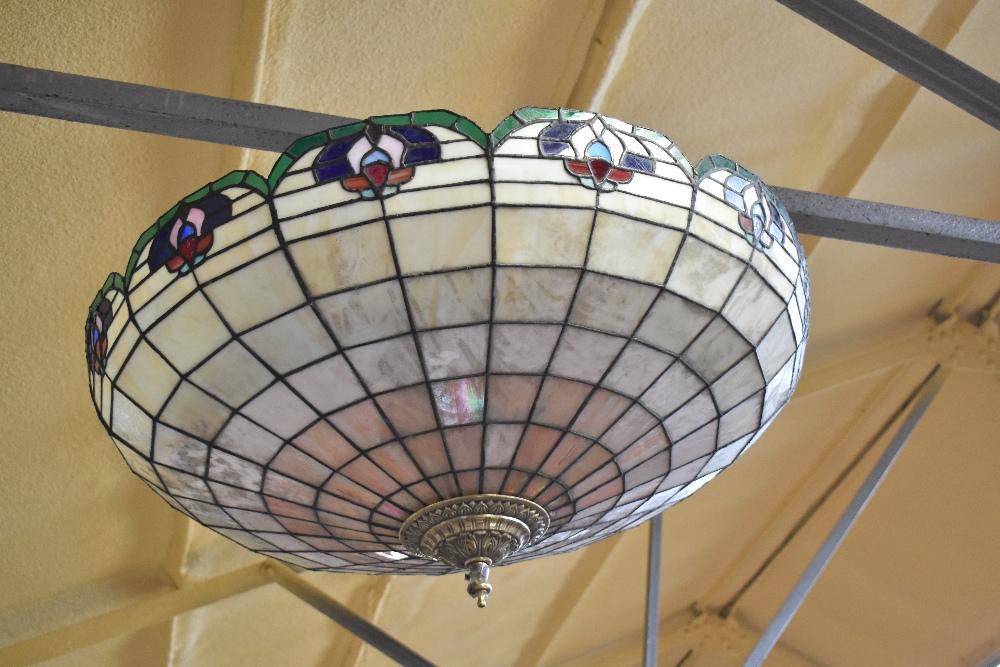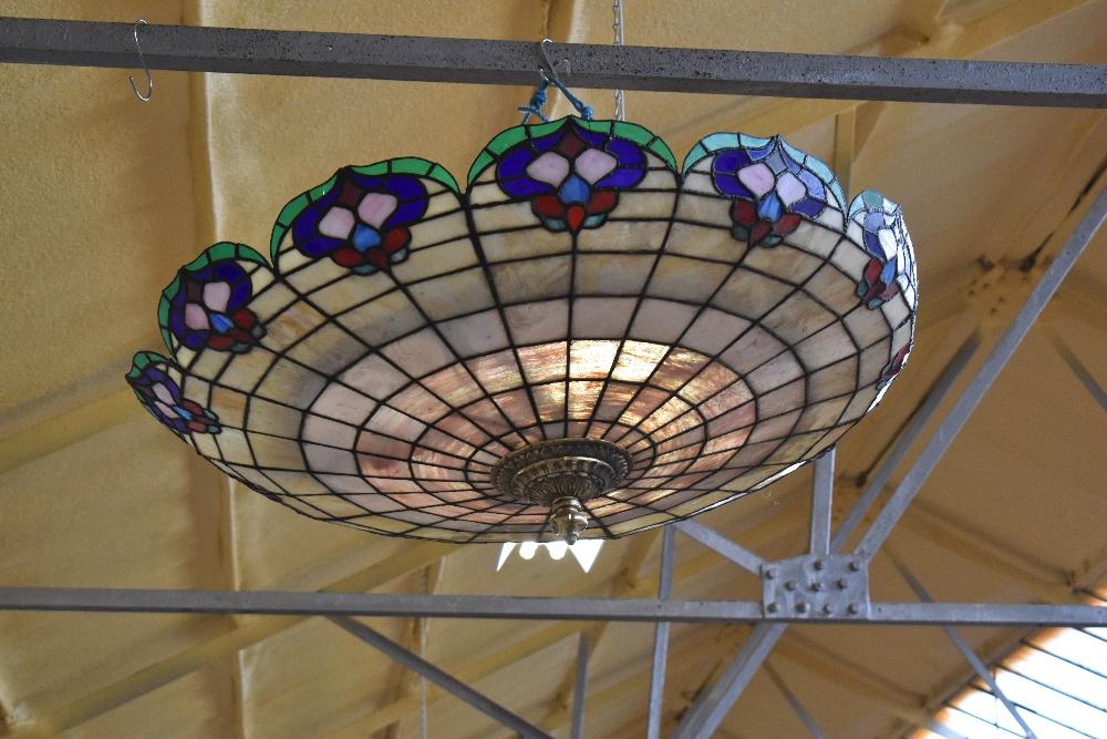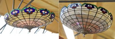 Lot 1305 of 2475: A very large pair of Liberty-style contemporary ceiling lights with stylised floral border and leaded bands throughout with embossed brass box, diameter approx 120cm.