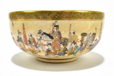 Lot 1311 of 2475: SHOKO TAKEBE; a fine Japanese Meiji period Satsuma bowl, the interior and exterior decorated with a continuous procession with lozenge decorated band to the interior and stylised floral band to the exterior, painted signature and gold seal mark to base, diameter 11.2cm. Inscribed in Katakana Thomas B Blow.  The English dealer Thomas B Blow, whose name appears only on work signed by Takebe, lived in Japan from at least 1906 until 1914 and returned there in 1930.  He was responsible for providin