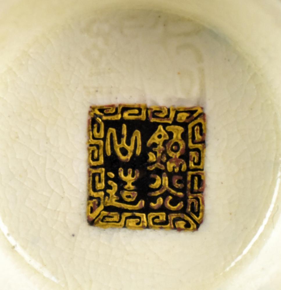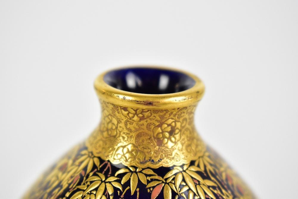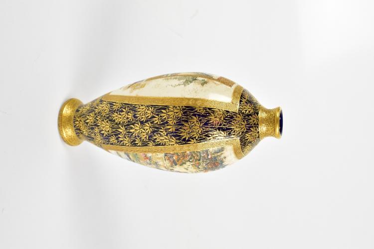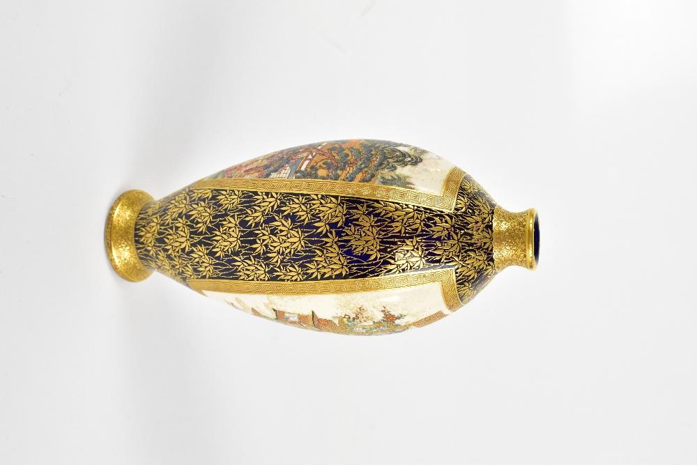 Lot 1312 of 2475: KINKOZAN; a fine Japanese Meiji period ovoid vase, the front panel decorated with a detailed landscape, the reverse with auspicious items within a framed panel and with detailed gilt decoration to the cobalt blue ground throughout, painted seal mark to base, height 18cm. Provenance: From a private Worcestershire collection.