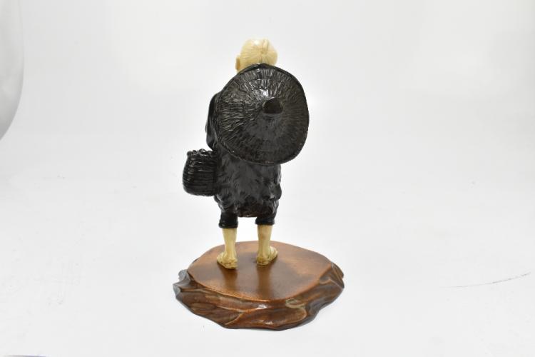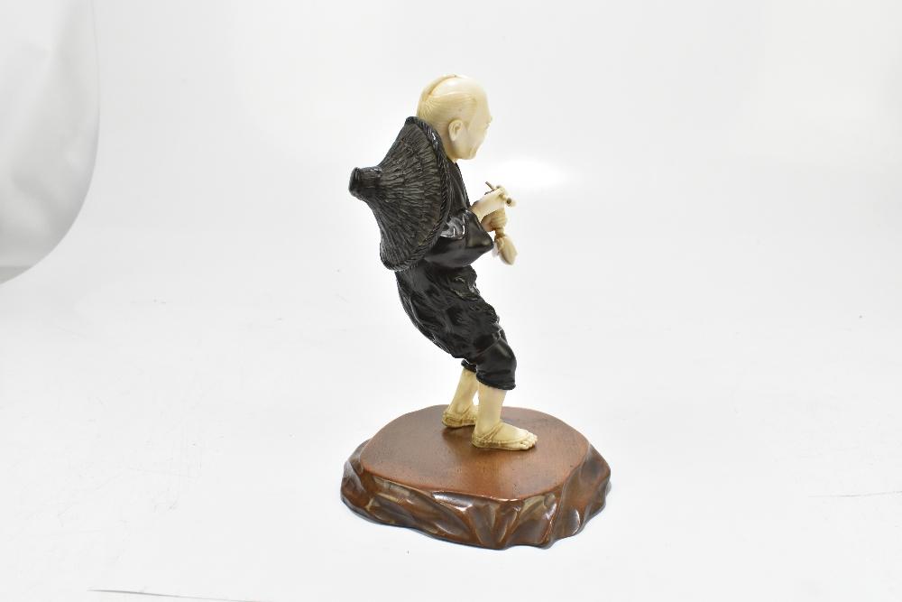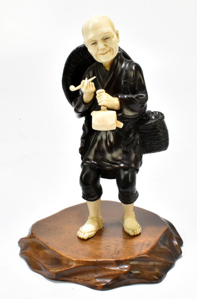Lot 1401 of 2475: A Japanese Meiji period bronze and ivory okimono of a standing elder holding a pipe, raised on a wooden plinth base, height 19cm.